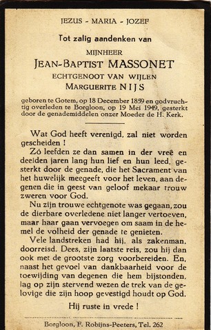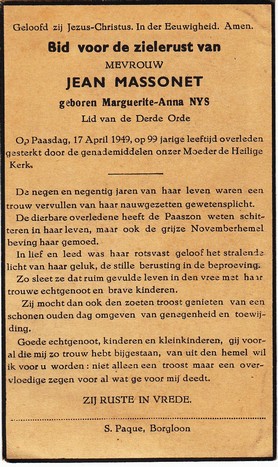 Nijs, Marguerite Anna, geboren op circa 1850, overleden op 17-04-1949 te Borgloon, echtgenoot van Massonet Jean.