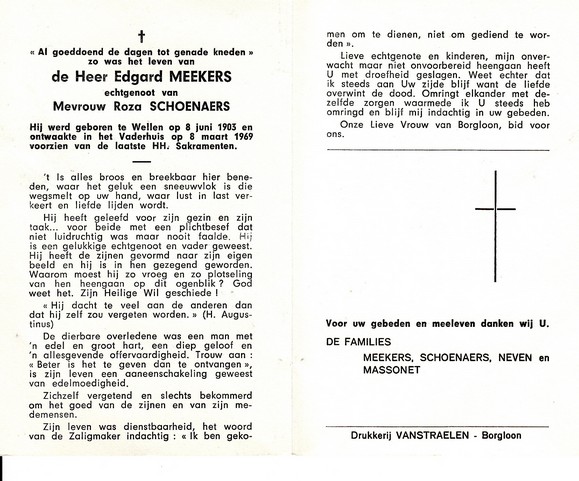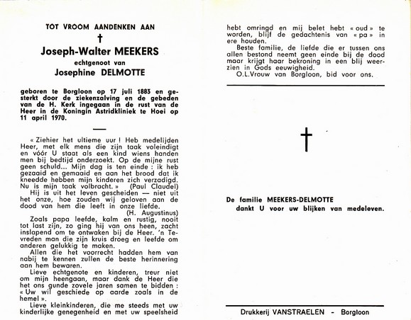 Grommen, Jan, geboren op 12-10-1916 te Borgloon, overleden op 13-01-2001 te St.Truiden op 84-jarige leeftijd, gehuwd met Meekers Louisa.