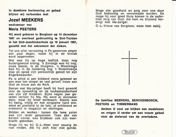 Peeters, Maria, geboren op 07-09-1884 te St.Truiden, overleden op 24-11-1972 te Borgloon op 88-jarige leeftijd, gehuwd met Meekers Jozef.