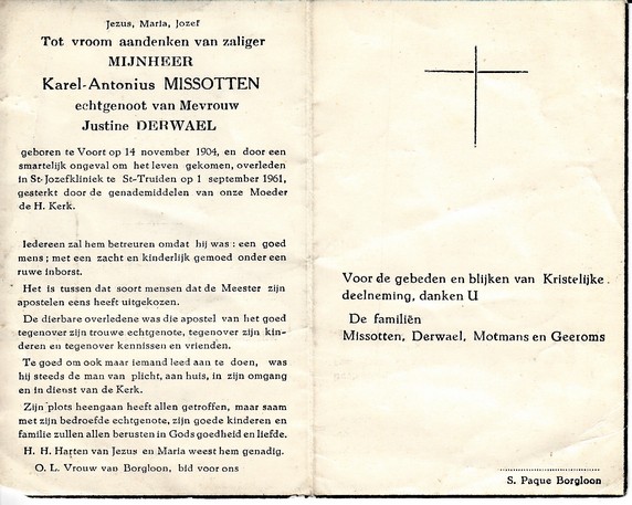 Groffils, Jean, geboren op 25-05-1910 te Borgloon, overleden op 19-02-1978 te St Truiden op 67-jarige leeftijd, gehuwd met Missotten Lutgard.