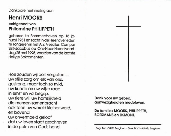 Ory, Hendrik, geboren op 24-04-1910 te Borgloon, overleden op 21-03-1992 te Tongeren op 81-jarige leeftijd, gehuwd met Missotten Josephine.