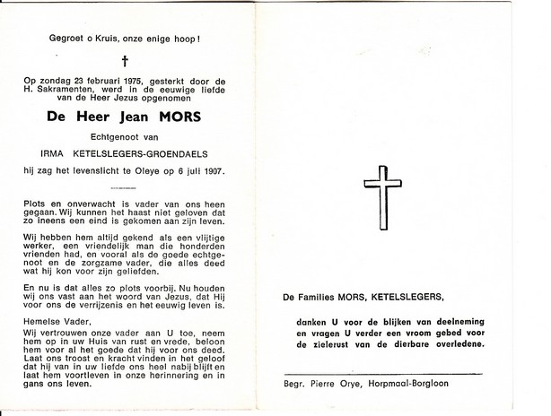 Ory, Jean, geboren op 19-07-1906 te Borgloon, overleden op 23-05-1978 te Kerniel op 71-jarige leeftijd, gehuwd met Proesmans Jeanne.