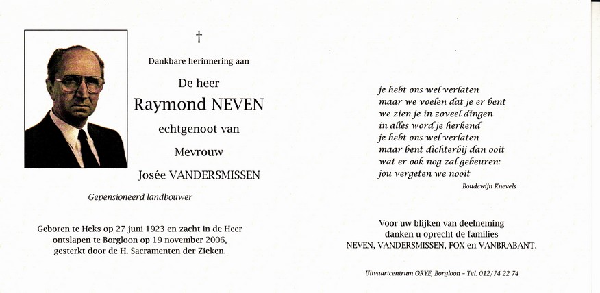 Neven, Raymond, geboren op 27-06-1923 te Heks, overleden op 19-11-2006 te Borgloon op 83-jarige leeftijd, echtgenoot van Vandersmissen Josée.