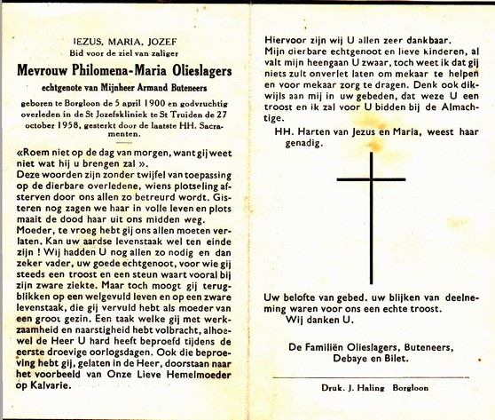 Olieslagers, Philomena Maria, geboren op 05-04-1900 te Borgloon, overleden op 27-10-1958 te St.Truiden op 58-jarige leeftijd, gehuwd met Buteneers Armand.