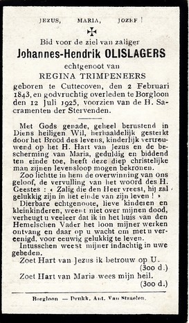 Olislagers, Johannes Hendrik, geboren op 02-02-1843 te Cuttecoven, overleden op 12-07-1925 te Borgloon op 82-jarige leeftijd, echtgenoot van Trimpeneers Regina.