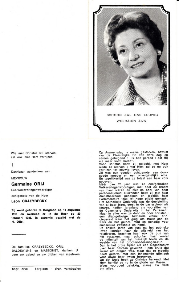 Orij, Germaine, geboren op 11-08-1919 te Borgloon, overleden op 20-02-1985 te Borgloon op 65-jarige leeftijd, gehuwd met Craeybeckx Leon.