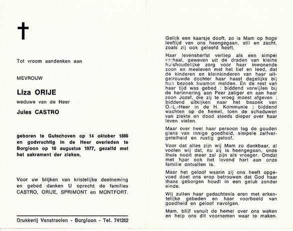 Orije, Liza, geboren op 14-10-1886 te Gutschoven, overleden op 10-08-1977 te Borgloon op 90-jarige leeftijd, gehuwd met Castro Jules.