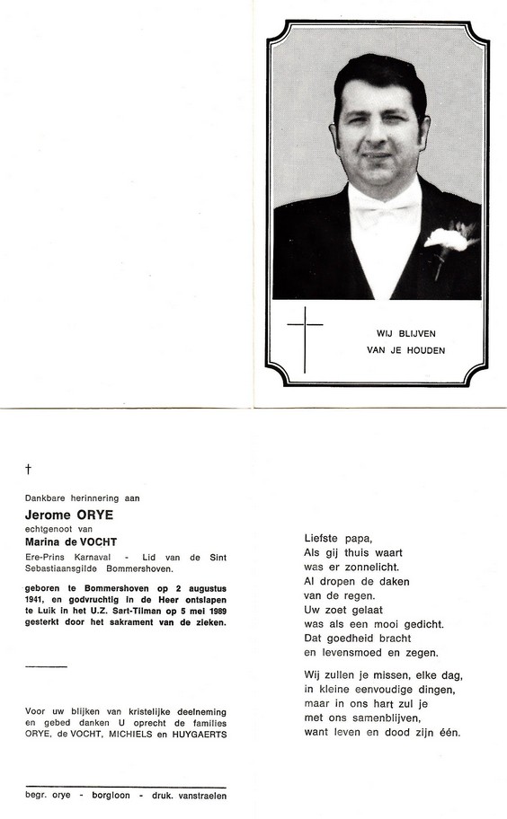 Orye, Jerome, geboren op 02-08-1971 te Bommershoven, overleden op 05-05-1989 te Luik op 17-jarige leeftijd, gehuwd met de Vocht Marina.