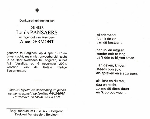 Pansaers, Louis, geboren op 04-04-1917 te Borgloon, overleden op 06-11-2001 te Tongeren op 84-jarige leeftijd, echtgenoot van Dermont Alice.