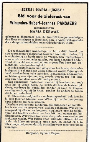Pansaers, Winandus Hubert Joannes, geboren op 30-06-1875 te Horpmaal, overleden op 13-04-1948 te Borgloon op 72-jarige leeftijd, echtgenoot van Derwae Maria.