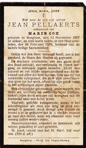 Pellaerts, Jean, geboren op 12-11-1867 te Borgloon, overleden op 24-02-1929 te Borgloon op 61-jarige leeftijd, echtgenoot van Cox Marie.