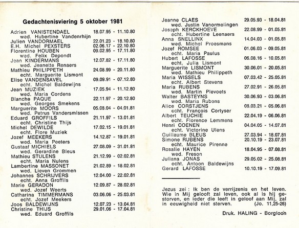 Olislagers, Jeanne, geboren op 09-04-1920 te Borgloon, overleden op 21-10-1984 te Borgloon op 64-jarige leeftijd, gehuwd met Lismont Jean.