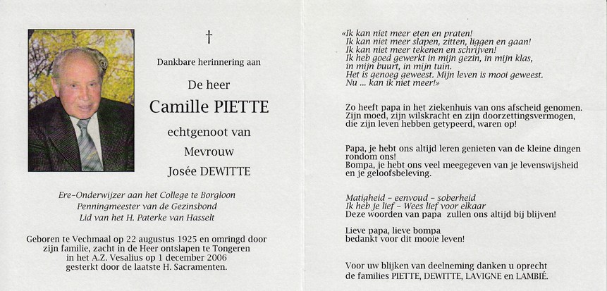 Piette, Camille, geboren op 22-08-1925 te Vechtmaal, overleden op 01-12-2006 te Tongeren op 81-jarige leeftijd, echtgenoot van Dewitte Josée.
