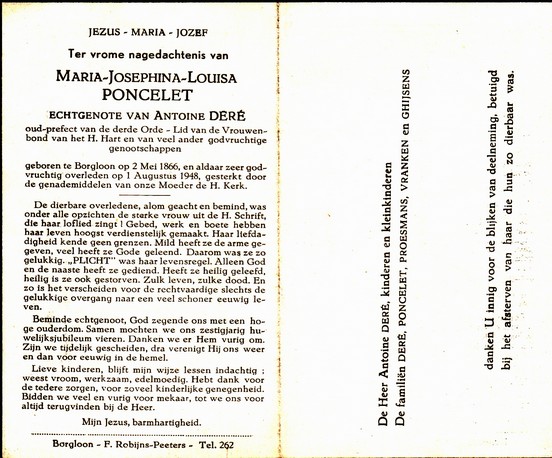 Poncelet, Maria Josephina Louisa, geboren op 02-05-1866 te Borgloon, overleden op 01-08-1948 te Borgloon op 82-jarige leeftijd, echtgenote van Deré Antoine.
