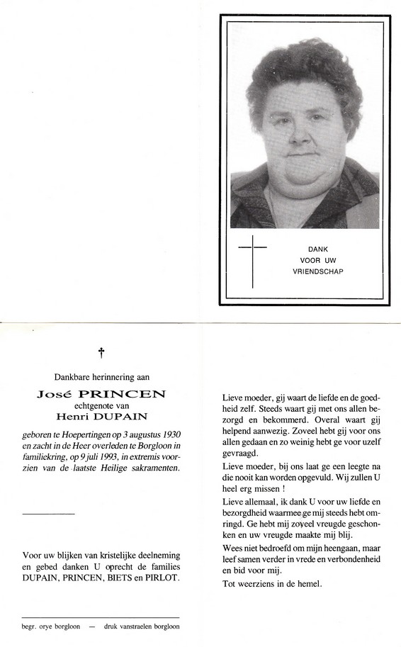 Princen, José, geboren op 03-08-1930 te Hoepertingen, overleden op 09-07-1993 te Borgloon op 62-jarige leeftijd, gehuwd met Dupain Henri.