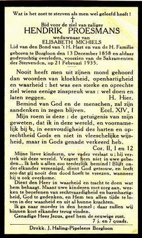 Proesmans, Hendrik, geboren op 13-12-1858 te Borgloon, overleden op 21-02-1935 te Borgloon op 76-jarige leeftijd, weduwnaar van Michiels Elisabeth.