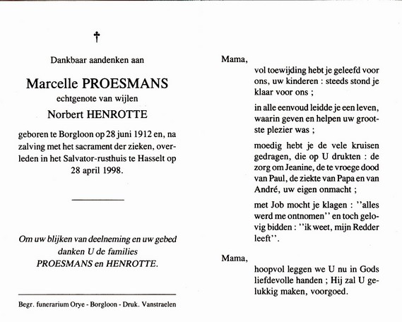 Proesmans, Marcella, geboren op 28-06-1912 te Borgloon, overleden op 28-04-1998 te Hasselt op 85-jarige leeftijd, weduwe van Henrotte Norbert.