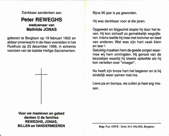 Verhaeren, Jozef, geboren op 20-03-1888 te Ordingen, overleden op 02-03-1982 te Borgloon op 93-jarige leeftijd, gehuwd met Loix Catharina.
