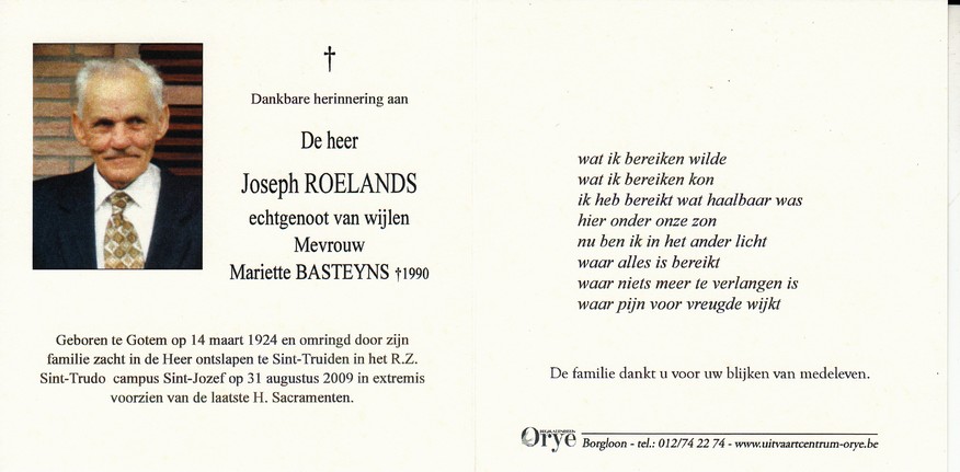 Poesen, Gustaaf, geboren op 28-01-1928 te Grote-Spouwen, overleden op 06-07-2009 te Tongeren op 81-jarige leeftijd, echtgenoot van Withofs Josée.