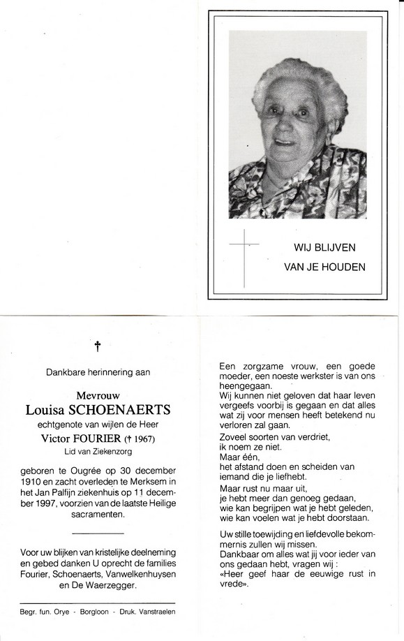 Vannut, Isabelle, geboren op 26-07-1914 te Grootloon, overleden op 16-05-1995 te Borgloon op 80-jarige leeftijd, echtgenote van Derwael Jean.
