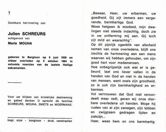 Vanstraelen, Maurice, geboren op 18-04-1941 te St Truiden, overleden op 10-08-1987 te Borgloon op 46-jarige leeftijd, gehuwd met Princen Josepha.