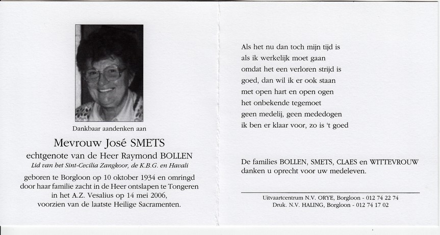 Vanmuysen, Juliette, geboren op 03-08-1937 te Borgloon, overleden op 09-11-2006 te Borgloon op 69-jarige leeftijd, weduwe van Abeels Freddy.