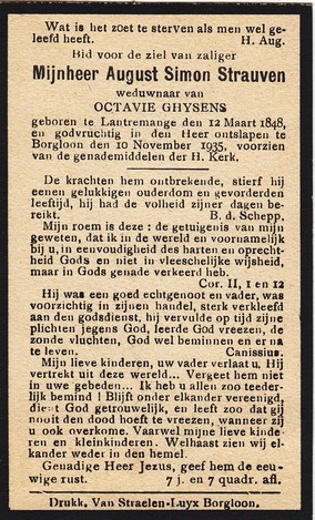 Vansteen, Guillaume, geboren op 18-02-1902 te Borgloon, overleden op 29-02-1968 te St Truiden op 66-jarige leeftijd, gehuwd met Vandersmissen Louisa.