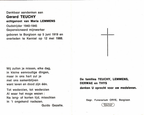 Vanmuysen, Gustaaf, geboren op 16-09-1909 te Gotem, overleden op 08-09-1987 te Borgloon op 77-jarige leeftijd, gehuwd met Macoye Jeanne.
