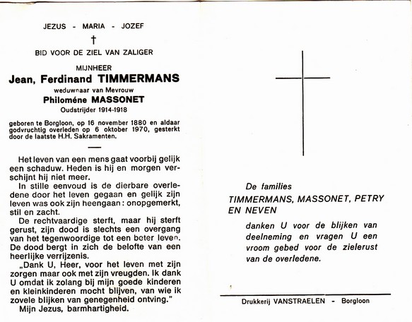 Vansteen, Jules, geboren op 08-10-1904 te Borgloon, overleden op 05-10-1964 te Borgloon op 59-jarige leeftijd, gehuwd met Timmermans Jeanne.