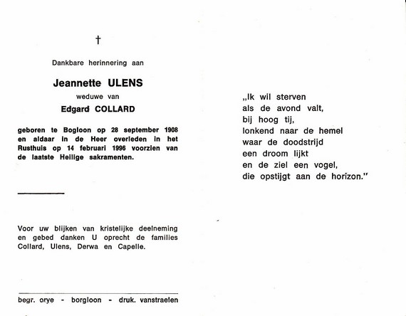 Pulinx, Jeanne, geboren op 06-11-1931 te Wellen, overleden op 15-01-2000 te Borgloon op 68-jarige leeftijd, gehuwd met Paulus Eduard.
