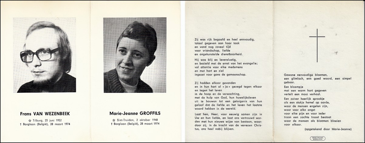 Van Wezenbeek, Frans, geboren op 23-06-1952 te Tilburg (Nederland), overleden op 28-03-1974 te Borgloon op 21-jarige leeftijd, gehuwd met Groffils Marie Jeanne.