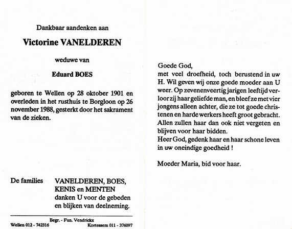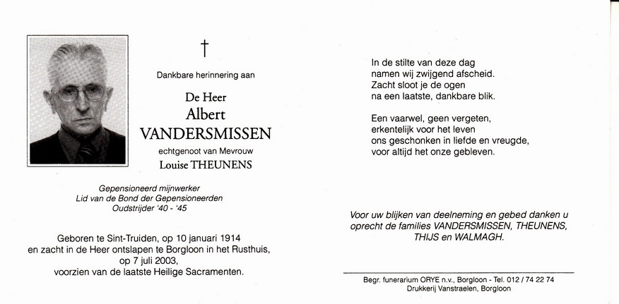 Vanmuysen, Walther, geboren op 17-10-1912 te Wellen, overleden op 10-02-1987 te Borgloon op 74-jarige leeftijd, echtgenote van Vanistendael Albertine.