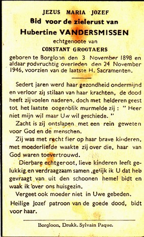 Vannut, Maria Alfons, geboren op 26-12-1921 te Borgloon, overleden op 29-10-1971 te Tongeren op 49-jarige leeftijd, gehuwd met Van Troos Robert.