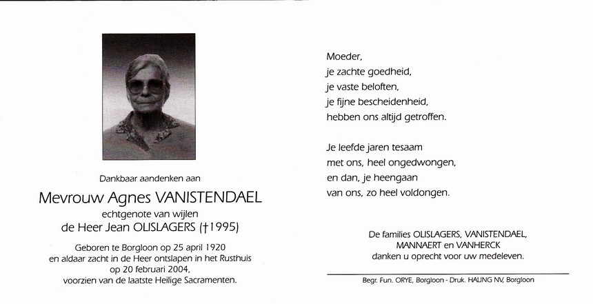 Vanstapel, Germaine, geboren op 15-06-1920 te Mielen-boven-Aalst, overleden op 05-07-1999 te Borgloon op 79-jarige leeftijd, weduwe (1) van Herbots Albert, gehuwd (2) met Maes Jozef.