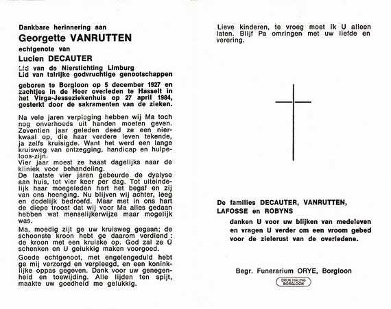 Vanrutten, Georgette, geboren op 05-12-1927 te Borgloon, overleden op 27-04-1984 te Hasselt op 56-jarige leeftijd, gehuwd met Decauter Lucien.