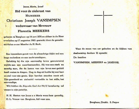 Vansimpsen, Christiaan Joseph, geboren op 14-06-1876 te Borgloon, overleden op 17-08-1965 te Borgloon op 89-jarige leeftijd, gehuwd met Meekers Florentia.