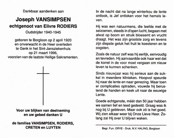 Vansimpsen, Joseph, geboren op 02-04-1920 te Borgloon, overleden op 21-03-1996 te Genk op 75-jarige leeftijd, echtgenoot van Rodiers Elivre.